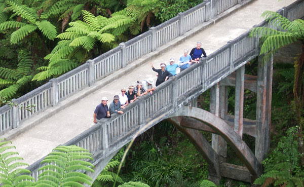 - Started in January 1935 and completed in June 1936, this bridge was built by the Raetihi firm of Sandford and Brown, for the Public Works Department. It is 130 feet long, and 125 feet above the stream. The cost of labour was 598 pounds 11 shillings 7 pence, and cartage of all materials (via the Mangapurua Valley road) cost 419 pounds 14 shillings. Unfortunately the cost of materials was not recorded. Aggregate for the concrete is said to have been transported from the Rangitikei River. The completion of the bridge was delayed considerably due to floods, slips, and the consequent delay in the supply of materials. The bridge was built to facilitate vehicular access to the Wanganui River, to link the settlers of the valley with the riverboat service. In 1917 the Government opened up the valley for settlement by soldiers returning from World War I. Virgin forest was cleared, and a total of 35 holdings developed. A school was opened, and for some years the valley prospered. However economic hardship, and problems associated with the remoteness and difficulty of access, resulted in many families abandoning their farms. By 1942 there were only 3 families left. After a major flood in January 1942 the Government declined to make further funds available for road maintenance, and it officially closed the valley in May 1942. The disappearing road line, old fence lines, stands of exotic trees, occasional brick chimneys, and this bridge serve as reminders of the ill fated settlement of the Mangapurua valley.